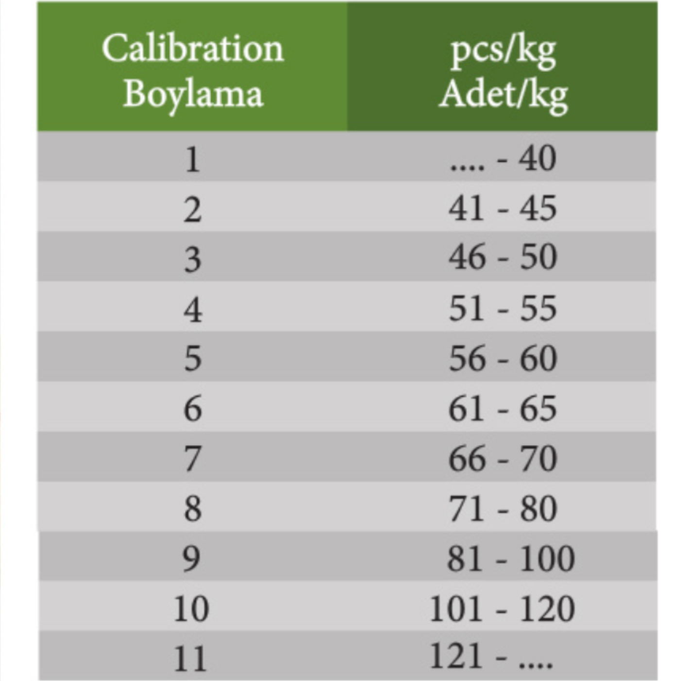 1 ile 10 numara arasında farklı boylarda kalibre edilen incirler, müşteri taleplerine göre; el işçiliğiyle şekil verilmek suretiyle farklı gramaj ve ambalajlarda işlenmektedir.